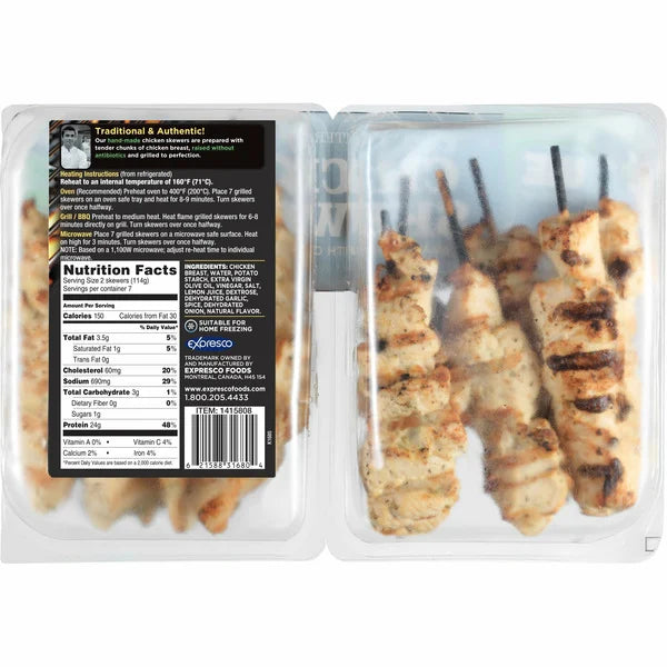 The West End Cuisine Grilled Chicken Skewers come in a pack of 14, each skewer weighing 2 ounces. These Mediterranean-style skewers are made with fully cooked chicken breast and are gluten-free, preservative-free, and raised without antibiotics. They provide 24 grams of protein per serving, making them a healthy and convenient option for meals. Keep them refrigerated and enjoy the delicious taste of West End Cuisine Grilled Chicken Skewers in your favorite dishes.