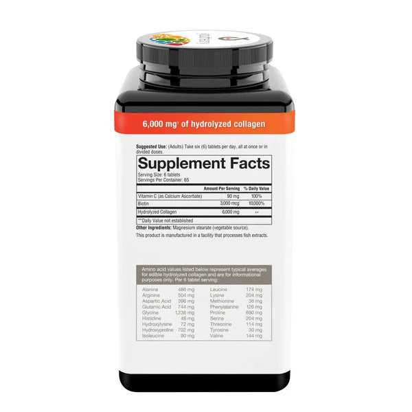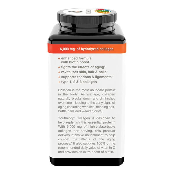 Youtheory Collagen Plus Biotin is a dietary supplement designed to support healthy skin, hair, nails, and joints. Each serving delivers 6,000 mg of hydrolyzed collagen types 1, 2, and 3 along with 18 amino acids, 3,000 mcg of biotin, and 90 mg of vitamin C to aid collagen synthesis and antioxidant protection. The formula is intended to combat age-related collagen loss and promote overall structural health throughout the body. With 390 tablets per bottle, it's a convenient option for daily use.