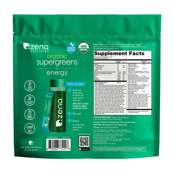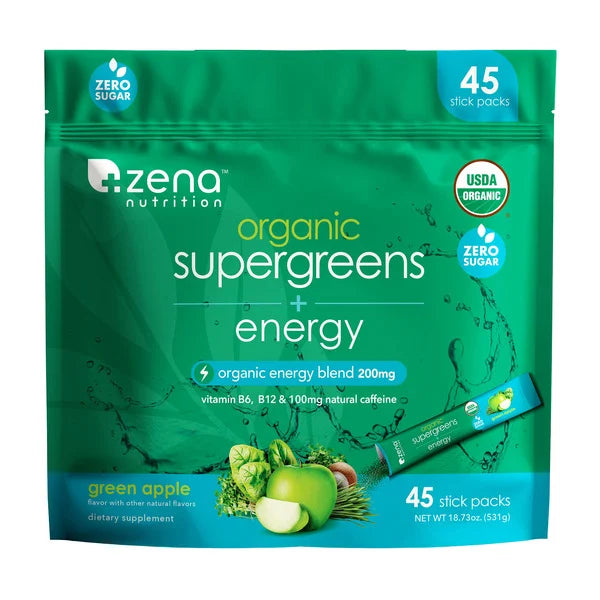 Zena Supergreens Plus Energy, in a pack of 45 stick packs, is a daily greens powder designed to support overall wellness and boost energy naturally. Each USDA-certified organic stick delivers over 70 superfoods, including fruits, vegetables, digestive enzymes, prebiotics, and probiotics. It features an organic energy blend with 100mg of natural caffeine plus vitamins B6 and B12, all with zero added sugar and 4 grams of fiber per serving. The convenient single-serve format makes it easy to stay energized and nourished whether you're at home or on the go.